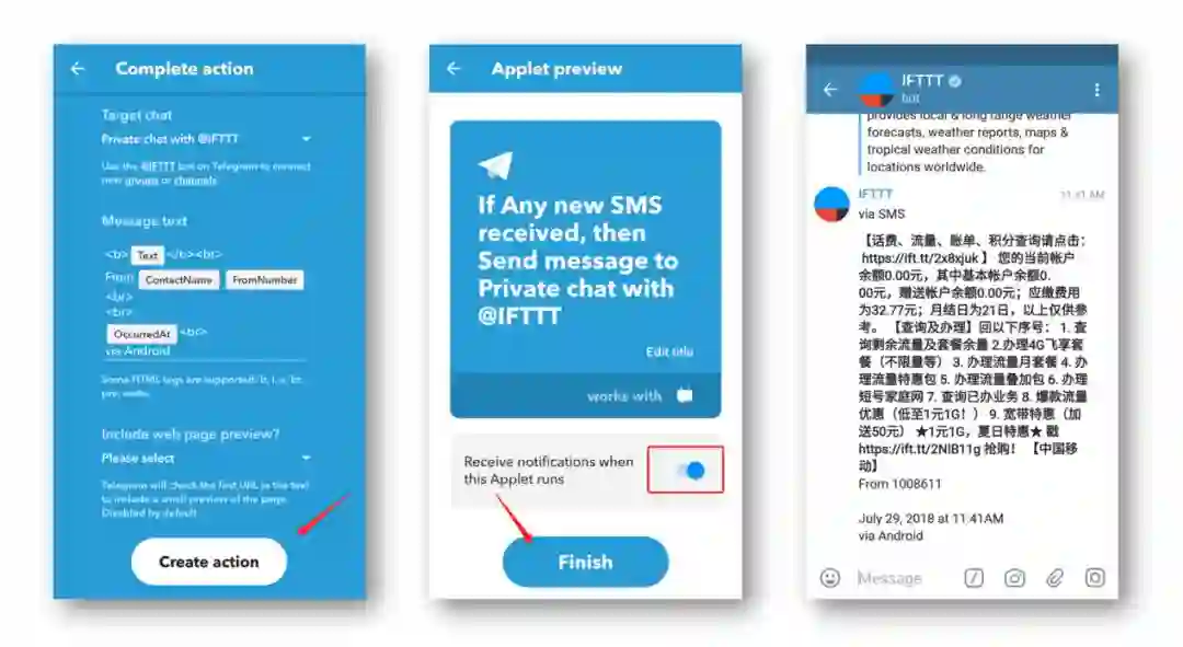 如果出门只带 iPhone ,或者当你的 Android 手机没电了怎么办 ?害怕在外接收不到重要的短信,你可以新建一个 Applet ,将你手机上收到的短信发送到 Telegram 。