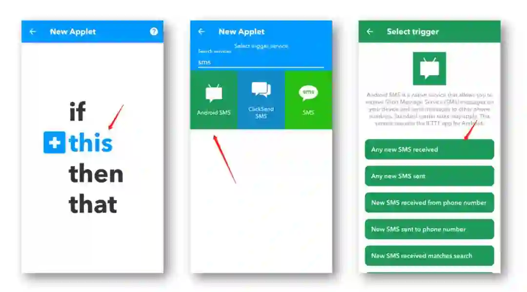 1、 打开 IFTTT 新建 Applet ,点击 " this " 在 services 中搜索找到 Android SMS ,选择第一项“ Any new SMS received (任何新收到的短信)”
