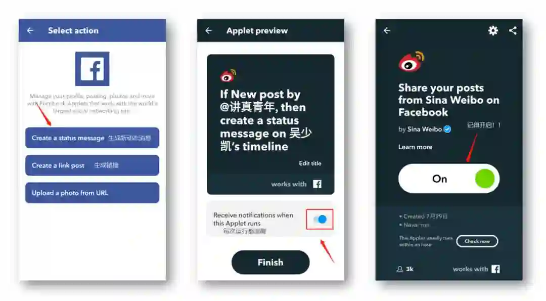 注意:以上步骤省略了 IFTTT 关联你的账号信息,建议在新建 Applet 的过程中先在手机上安装好微博和 FaceBook 并登录账号,方便 IFTTT 跳转关联。