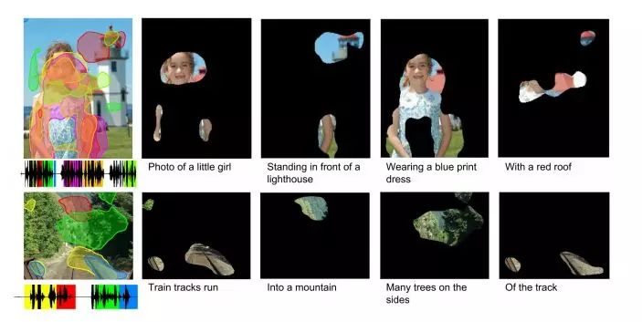 在该论文中,研究人员展示了他们的模型。他们使用的图像中有一个金发碧眼的小女孩,穿着蓝色连衣裙,背景是一座红顶的白色灯塔。该模型学会了建立图像中的元素与「女孩」、「金发」、「蓝眼睛」、「蓝色裙子」、「白色灯塔」和「红色屋顶」之间的关联。给出一段音频描述,模型会根据描述显示出图像中的每个目标。
