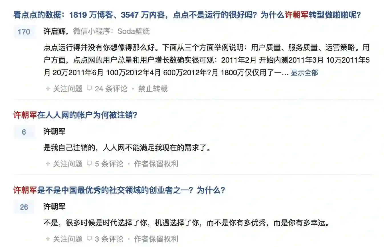 另外两个回答则更加有趣,许朝军称自己注销人人账户是因为人人网不能满足自己现在的需求的。在回答自己是不是中国社交领域最优秀的创业之时候,许朝军给出了这样的回应: