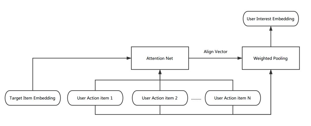 用户兴趣的向量化表达:为生成用户兴趣向量,我们对用户行为序列中的Item向量进行了包括Average Pooling、 Max Pooling与Weighted Pooling三种方式的融合。其中Weighted Pooling参考了DIN的实现,首先获取用户的行为序列,通过一层非线性网络(Attention Net)学出每个行为Item对于当前要预测Item的权重(Align Vector),根据学出的权重,对行为序列进行Weighted Pooling,最终生成用户的兴趣向量。计算过程如下图所示: