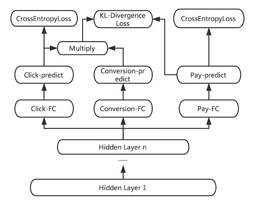 Multi-task DNN的网络结构如上图所示。线上预测时,我们将Click-output和Pay-output做一个线性融合。