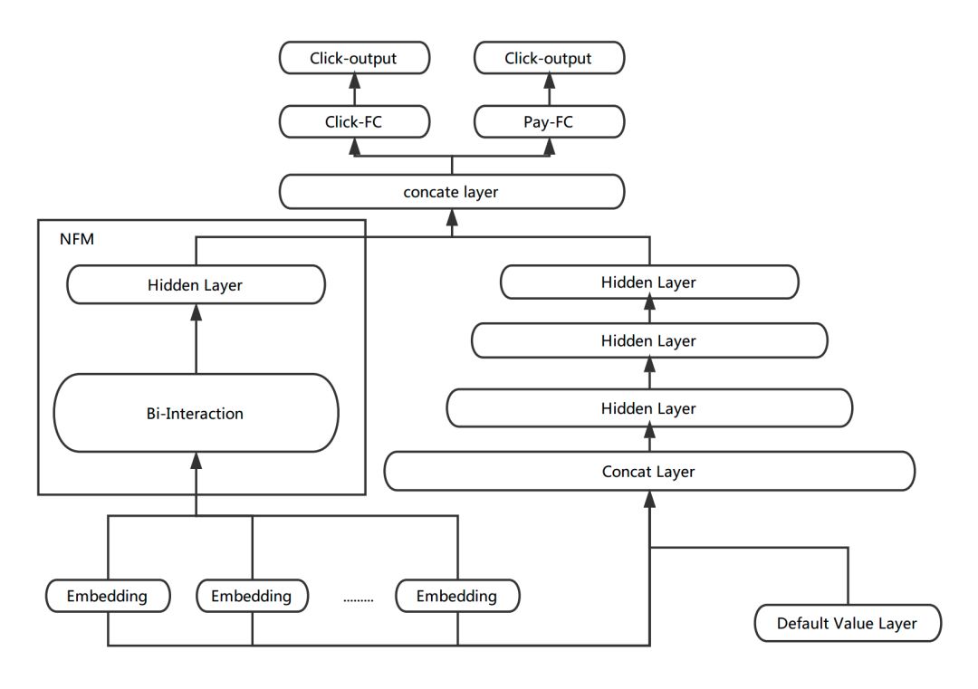 在Multi-task DNN模型上线后,为了进一步提升效果,我们利用DNN网络结构的灵活性,又做了多方面的优化尝试。下面就NFM和用户兴趣向量的探索做具体介绍。