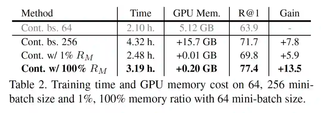 下图我们展示了在 SOP 上训练 XBM 时的计算资源消耗,即便把整个训练集(50K+)的特征都加载到 XBM,不过需要 0.2GB 的显存;而如果是使用增大 batch 的方法,会额外需要 15GB 显存,是 XBM 的 80 倍,但是效果的提升比 XBM 差很多。毕竟 XBM 仅仅需要存特征,特征也是直过去的 mini-batch 的前向计算的结果,计算资源的需求很小。