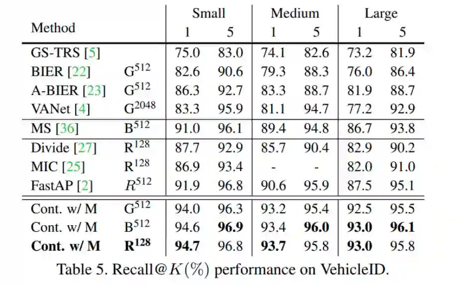与最近的深度度量学习方法对比,我们在四个检索数据库上效果均大幅提升,这里仅列出 VehicleID 的效果,其他数据集的效果见原论文。