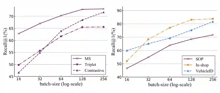 然而,无论是第一种方法的额外注重难样本,还是第二种方法的小范围采样,他们的难例的挖掘能力其实依然有一个天花板——那就是 mini-batch 的大小。这个 mini-batch 的大小决定了在模型中单次迭代更新中,可以利用的样本对的总量。因此,即使是很精细的采样加权方法,在 mini-batch 大小有限的情况下,也很难有顶级的表现。我们在三个标准图像检索数据库上进行了实验,基于三种标准的 pair-based 方法,我们发现随着 mini-batch 变大,效果(Recall@1)大幅提升。实验结果如下图: