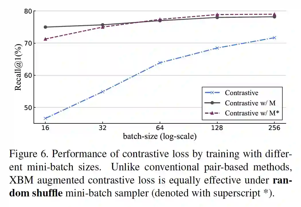 不难发现,XBM 其实直接和过去基于样本对的方法结合,只需要把原来的 mini-batch 内的样本对换成当前 mini-batch 和 XBM 的特征构成的样本对就可以了。所以,我们通过 XBM 这种存储特征的机制,能够让不同时序的 mini-batch 的特征成功配对。