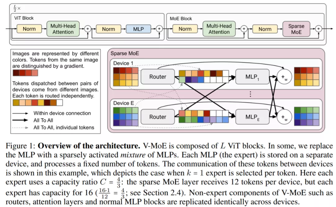 ViT 已被证明在迁移学习设置中具有良好的扩展性,在较少的预训练计算下,比 CNN 获得更高的准确率。ViT 将图像处理为一系列 patch,输入图像首先被分成大小相等的 patch,这些 patch 被线性投影到 Transformer 的隐藏层,在位置嵌入后,patch 嵌入(token)由 Transformer 进行处理,该 Transformer 主要由交替的自注意力和 MLP 层组成。MLP 有两个层和一个 GeLU 非线性。对于 Vision MoE,该研究用 MoE 层替换其中的一个子集,其中每个专家都是一个 MLP,如下图所示: