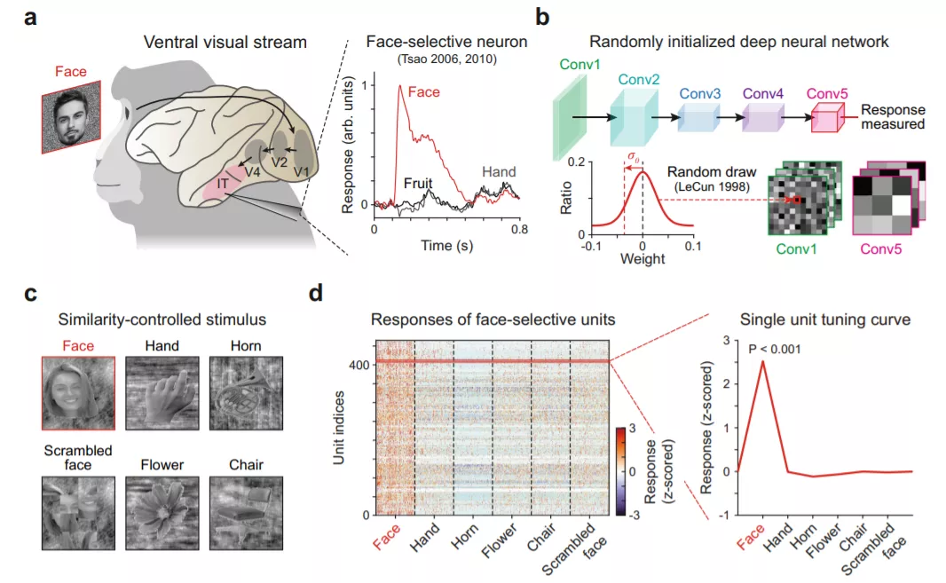 利用捕捉视觉皮层腹侧流(ventral stream)特性的模型神经网络——AlexNet45,研究小组发现,面孔选择性可以在随机初始化的 DNN 的不同条件下稳健地出现。而且,它们的面孔选择性指数(FSI)与那些在大脑中观察到的面孔选择性神经元相当。