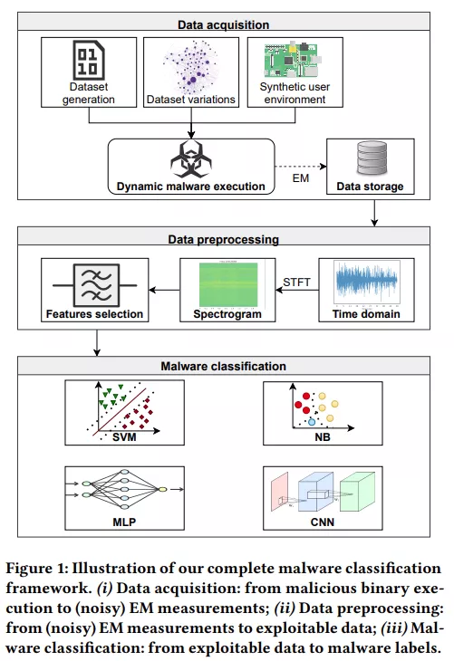 图 1 展示了该工作流:首先,研究者定义了威胁模型,当恶意软件在目标设备上运行时,收集电磁波发射信息。他们搭建了一个基础设施,能够运行恶意软件与一个现实的用户环境,同时防止感染主机控制器系统。然后,由于采集的数据非常嘈杂,需要进行预处理步骤来隔离相关的信息信号。最后,使用这个输出,研究者训练了神经网络模型和机器学习算法,以便分类恶意软件类型、二进制文件、混淆方法,并检测一个可执行文件是否打包。