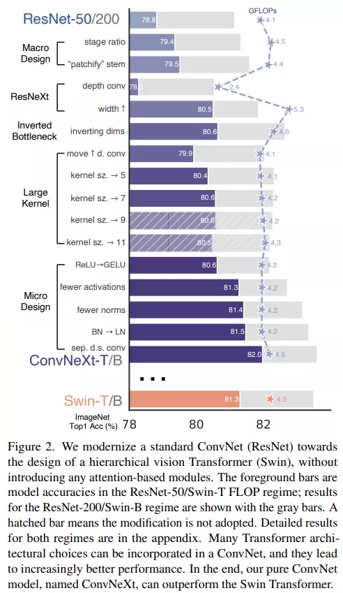 然后该研究制定了一系列设计决策,总结为 1) 宏观设计,2) ResNeXt,3) 反转瓶颈,4) 卷积核大小,以及 5) 各种逐层微设计。下图 2 展示了「升级网络」每一步的实现过程和结果,所有模型都是在 ImageNet-1K 上进行训练和评估的。由于网络复杂度和最终性能密切相关,因此该研究在探索过程中粗略控制了 FLOPs。
