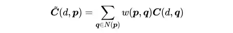 是在像素点 q 处,视差为 d 的经过聚合的匹配代价,像素点 q 属于p点的邻接像素点;
