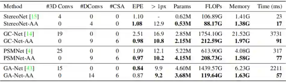 从上表结果可以看出,除了 GA-Net,其他具备 AANet 模块的模型准确率都高一些。并且从参数量,计算量和内存占用量以及运行时间上都有降低,可见 AANet 的确让立体匹配更加高效。