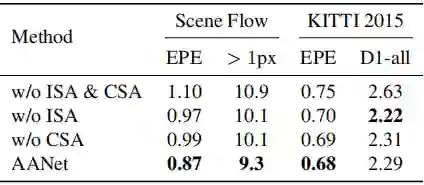 由上表可以看出,结合了 ISA 和 CSA 的 AANet 在两个数据集上表现最佳。