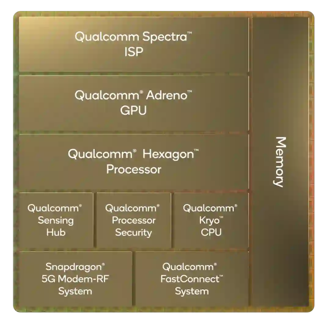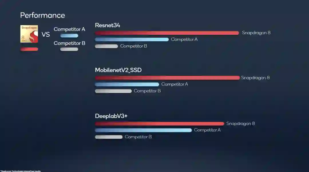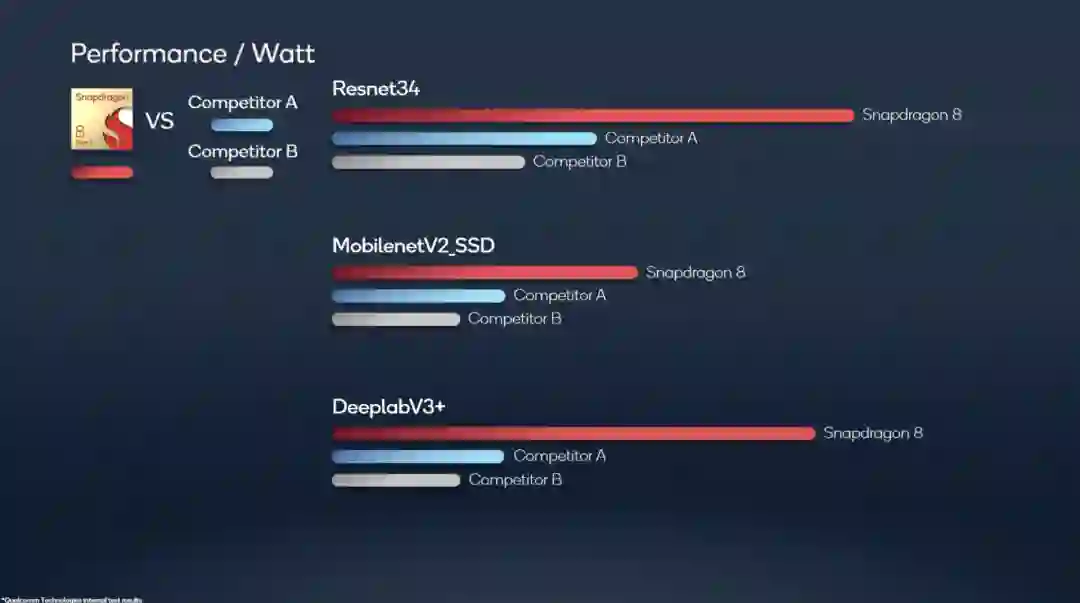 总体来讲,全新Hexagon处理器,搭配Kyro CPU,Adreno GPU和Sensing Hub,AI峰值性能较前代再次大幅提升4倍。
