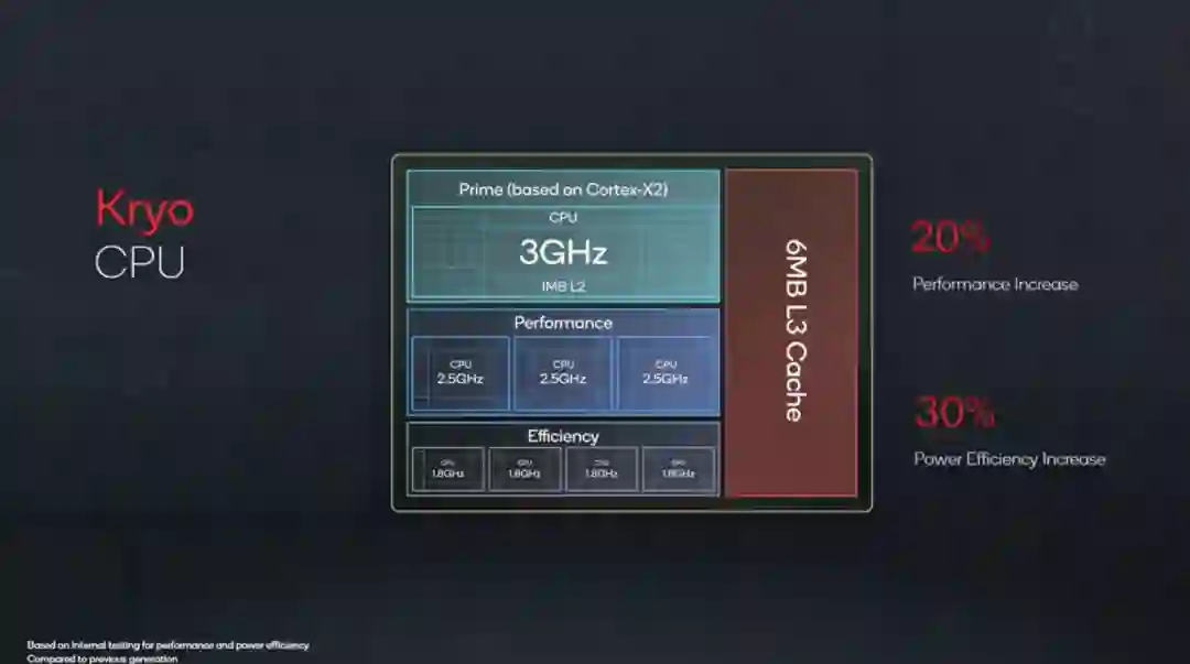 全新Kyro CPU采用Armv9架构,继续沿用「1+3+4」三丛集设计,1个Cortex-X2超大核(3.0Ghz),3个Cortex-A710大核(2.5GHz),4个Cortex-A510小核(1.8Ghz)。