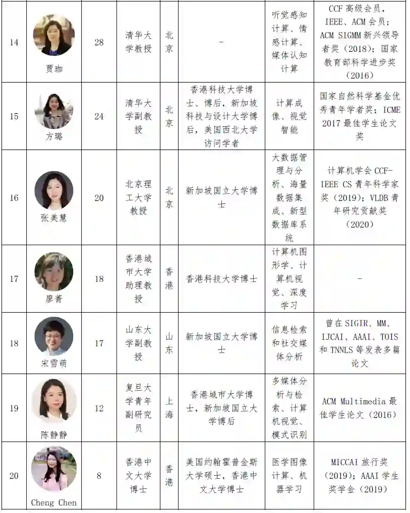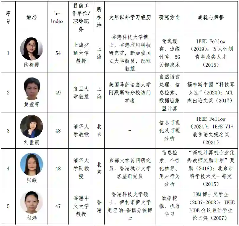 表5 2022 年中国人工智能相关领域全球女性学者列表