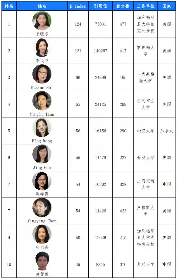 在262位人工智能相关领域全球女性学者中,共有71位华人,占比达27.1%。在71位华人女性学者中,23位工作单位在中国,48位工作单位在外国,其中美国39人,澳大利亚3人,加拿大2人,英国、法国、德国和新加坡各1人。由此可见,在美国工作的顶尖华人女性人工智能学者人数超过了中国,美国对华人女性学者依然具有较强吸引力。