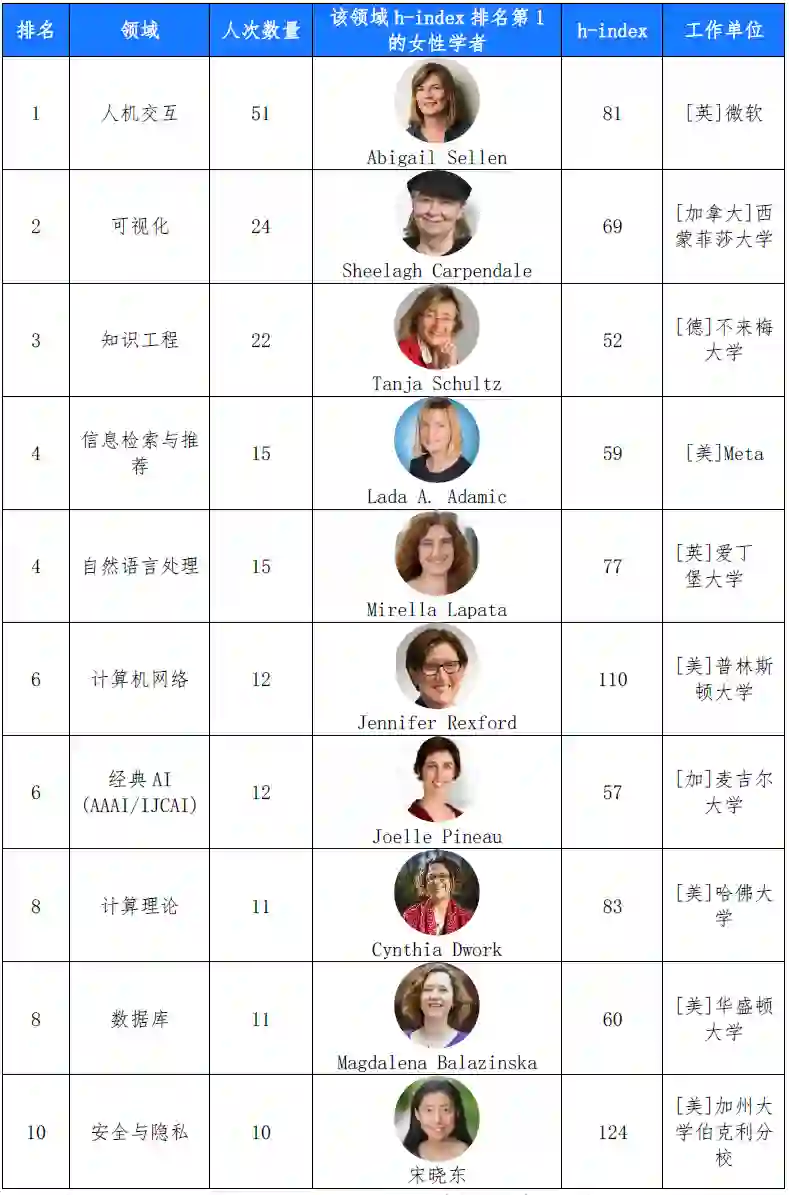 从全球女性学者的研究领域 分布看,人机交互领域的数量最多,达51人次;其次是可视化(24人次)和知识工程(22人次)领域。而机器学习(6人次)、机器人(6人次)和计算机系统(7人次)领域的女性学者人数最少。