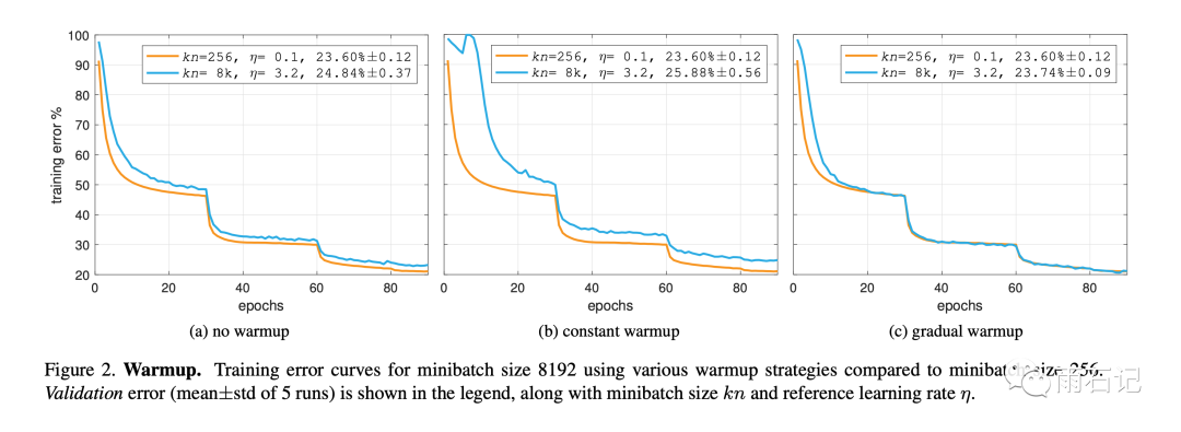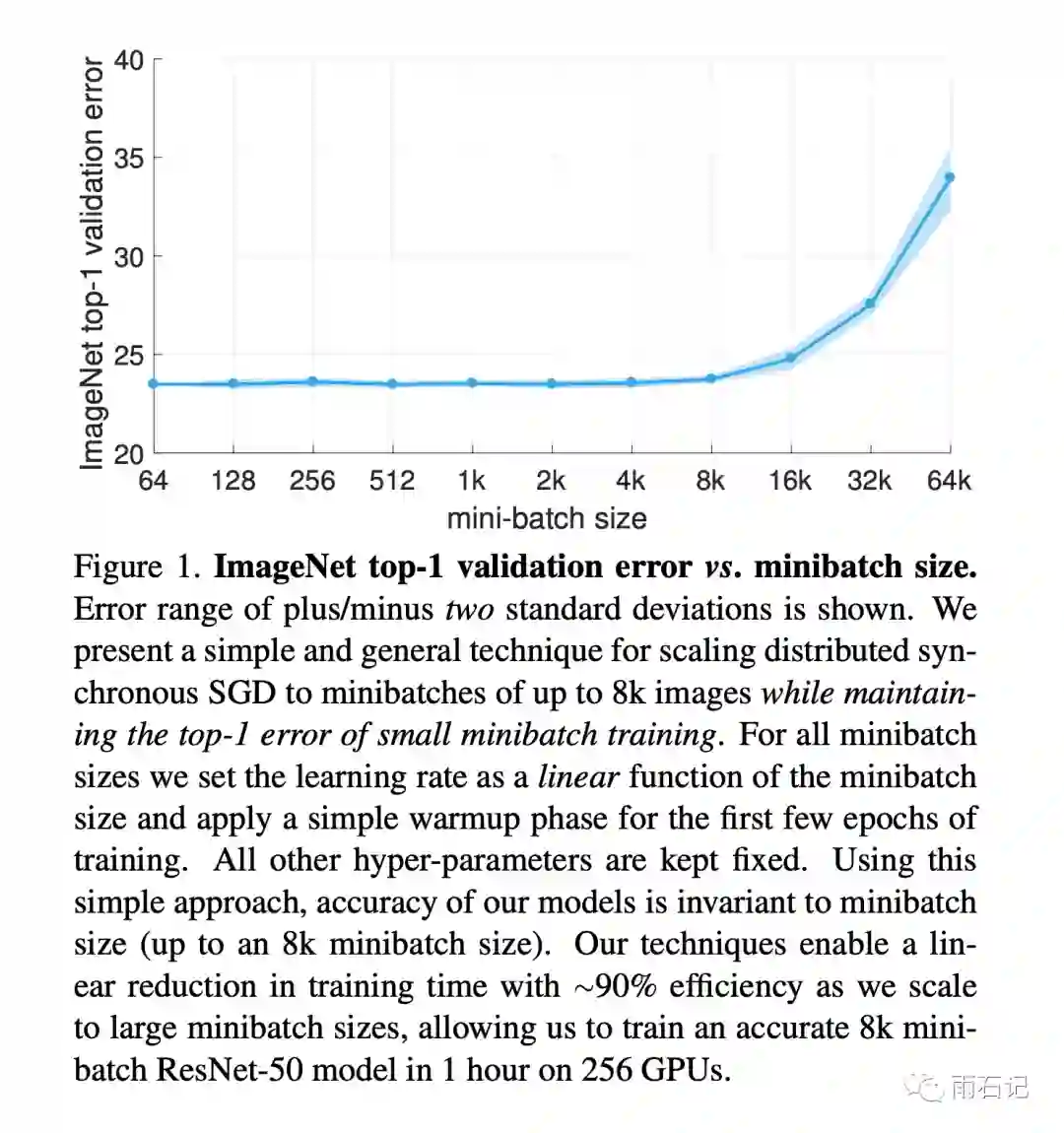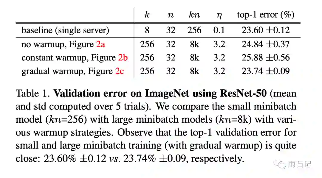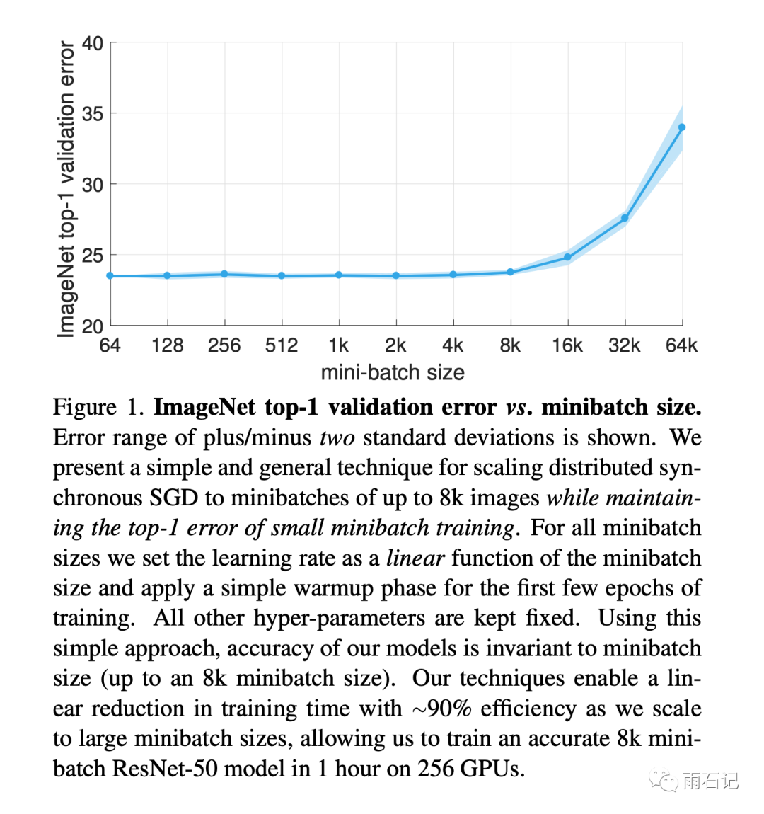 这是一篇实验性的论文,但是开启了一个潮流。这里最大的batch_size可以到达8k,后面还有可以到32k/64k的算法。这里的算法是在ResNet上做的,后面还有在Bert上做的。这里的训练时间是1小时,后面还有分钟级的改进。欢迎关注公众号【雨石记】,继续学习后面的内容。