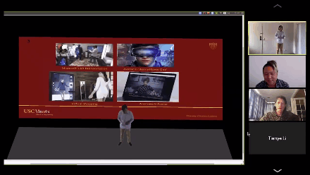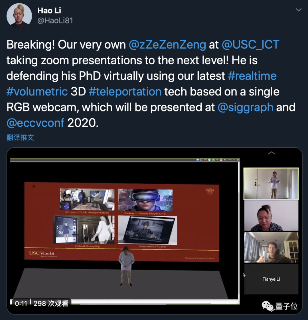 右上角就是真实的黄锃同学,他一边演讲,电脑实时把他变成3D模型投影到场景中,导师们看到这一幕不禁笑了,随手就是一个转发。