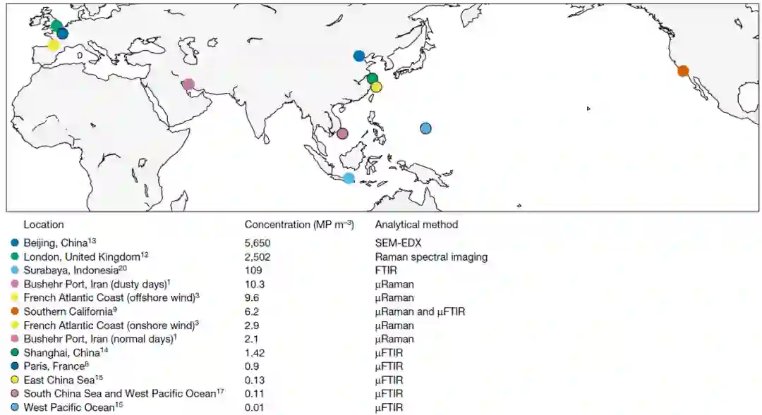 图 | 以前研究报告的空气微塑料浓度(来源:该论文)