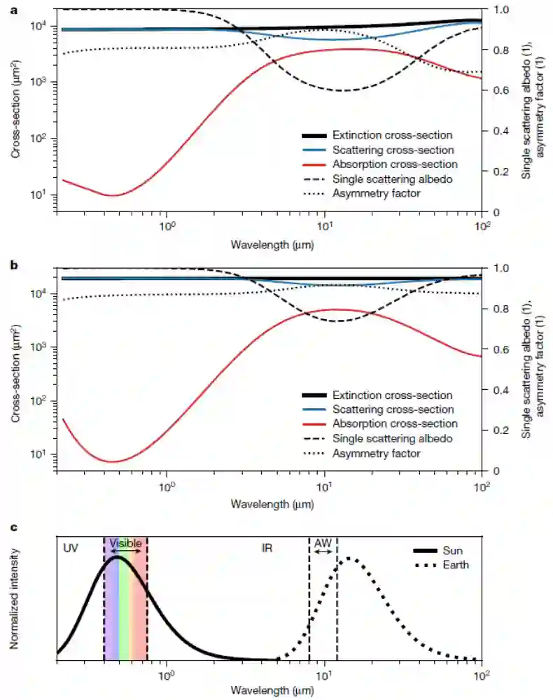 无色素的微塑料碎片和纤维的散射截面表明,微塑料能有效地散射紫外线(UV)和可见辐射,这本身就会对地表气候产生冷却影响。然而,吸收截面数据显示,微塑料吸收红外辐射,包括在 8 至 12 微米的大气窗口,在地球的大气中很少有其他物种吸收,微塑料又可能对温室效应有所贡献。