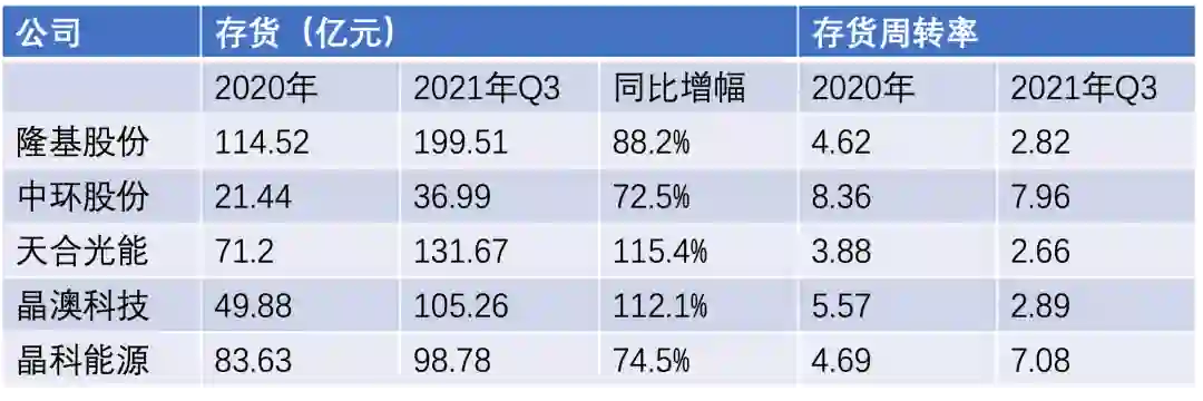 压力顺着产业链层层累积,下游装机的积极性大受打击,反过来又制造了上游的“库存危机”。隆基股份2021年三季度存货价值高达199.51亿元,以光伏组件为主;存货周转率则从2020年同期的4.62次缩水至2.82次。晶澳科技和天合光能的存货分别同比增长112.09%和115.36%,存货周转率同样呈现明显下降趋势。