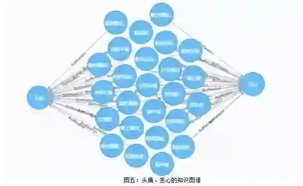 如何基于这种复杂的知识图谱研究出一套科学的智能诊断算法是本系统的核心与关键。前面已经提到,系统在诊断之前需要用户提供症状、年龄、性别等信息,当获取用户提供的本系统医学词典范围内的症状词后,系统会马上根据症状词获取此症状的知识图谱,假设用户提供了“头痛”与“恶心”两个症状词,此时的知识图谱如图三、图四所示:
