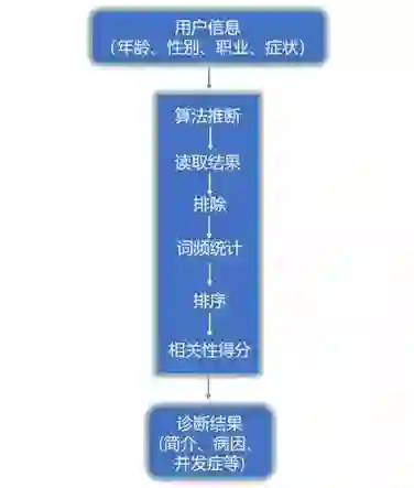 本系统需要用户输入个人信息(年龄、性别、职业、提供的症状词),系统根据用户年龄、性别、症状等个人信息进行算法分析、统计、排除、排序、得出相关性得分,最后将算法分析结果反馈给用户。关于算法的设计细节,本申报书的创新性部分会详细说明。项目的大致流程图如图一所示: