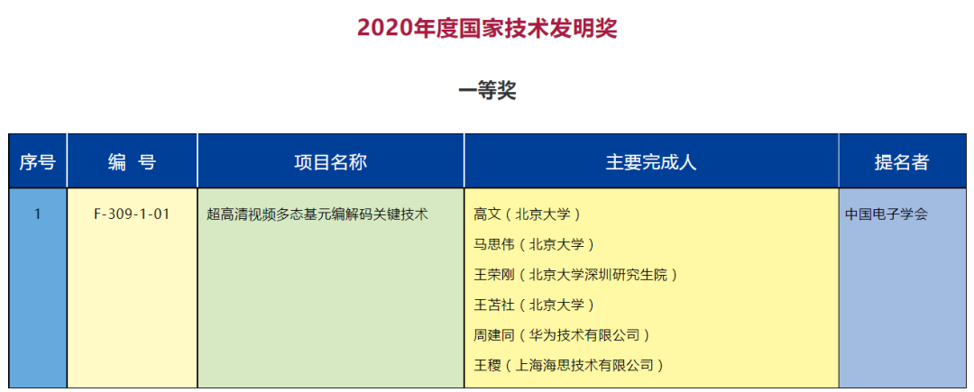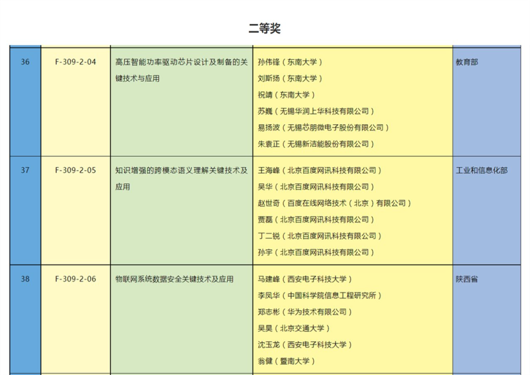 其中,北京大学高文等 6 位研究者凭借超高清视频多态基元编解码关键技术获得一等奖。在二等奖中,东南大学孙伟锋等 6 人、百度 CTO 王海峰等 6 人以及西安电子科技大学马建峰等 6 人分别凭借高压智能功率驱动芯片设计及制备的关键技术与应用、知识增强的跨模态语义理解关键技术与应用以及物联网系统数据安全关键技术与应用获奖。