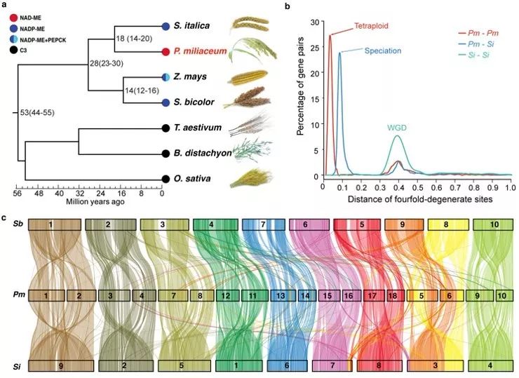 经典的C4光合作用研究将C4途径分为三种亚型:依赖NADP的苹果酸酶型(NADP-ME型)、依赖NAD的苹果酸酶型(NAD-ME型)、具有PEP羧激酶的天冬氨酸型(PEP-CK型)。近年来研究倾向于认为PEP-CK型无法独立存在,而是依赖于NADP-ME型或NAD-ME型而存在。糜子属于经典的NAD-ME型C4作物。通过糜子与其它作物基因组的比较和转录组分析发现,糜子基因组中NADP-ME型和NAD-ME型相关的酶和转运蛋白不但同时存在,而且在光合作用组织中维持较高的表达水平。研究人员认为C4途径三种亚型可能同时存在于糜子中,这些机制可能有助于糜子更好地应对田间环境的动态变化。