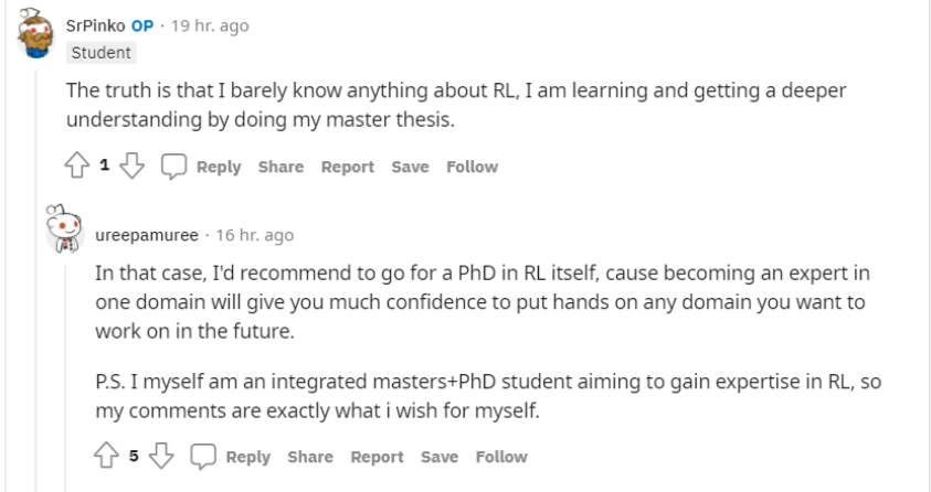 「这样的话...我推荐你读强化学习的博士。因为当你在一个领域成为专家以后,你再去接触别的你感兴趣的领域你就会更加自信。我当时硕博连读的就是强化学习专业,所以我跟你说的建议也是我自己想要做的。」