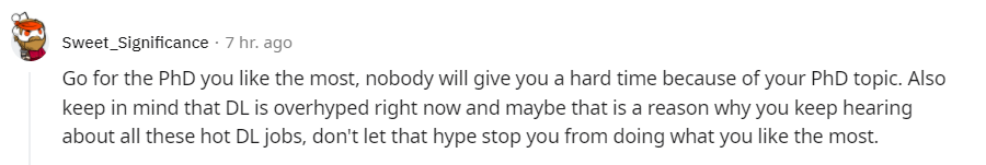 但总的来说,读博是一段漫长的旅程,肯定会很艰难。所以我是你的话,我会好好挑选一个感兴趣的课题,因为你要成为那个领域的专家的。」