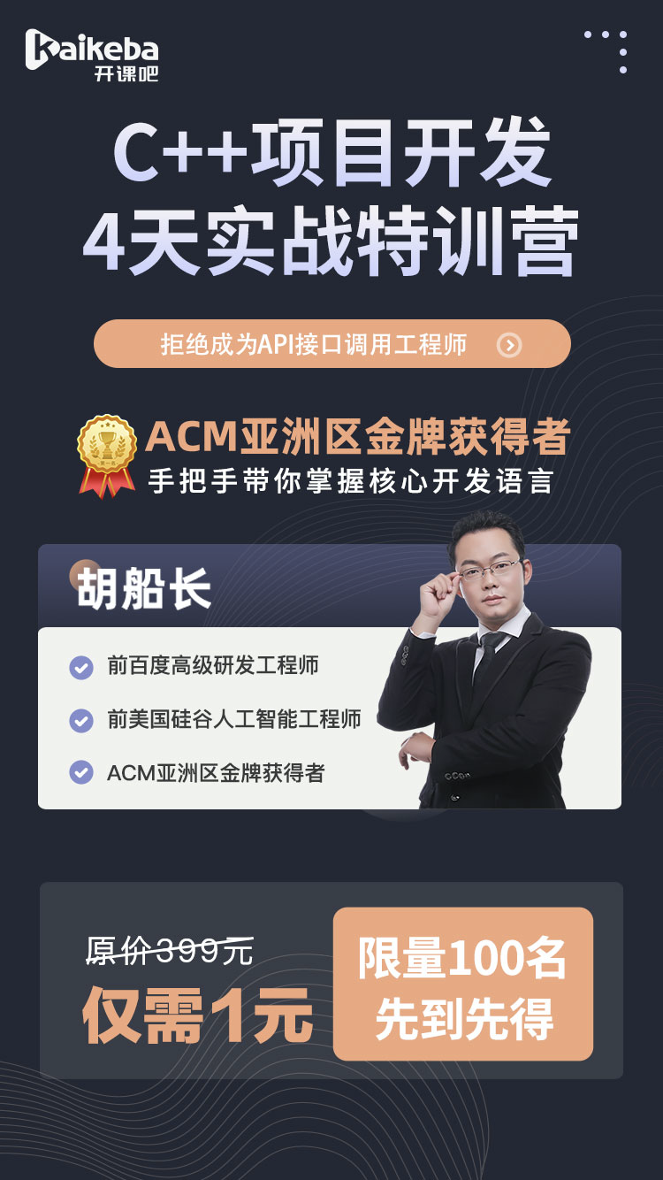这个特训营他会全程亲自授课,通过4天时间带你深入C++核心编程,完成1个google测试框架,并教你如何撰写简历、应对大厂面试!