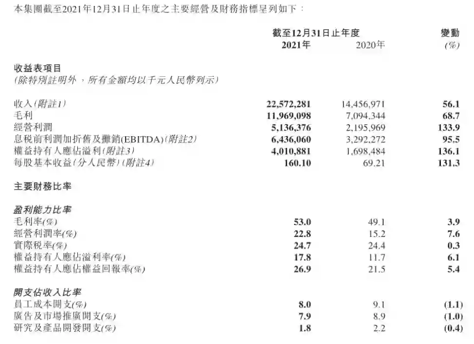 再细看2021年数据,其毛利上涨68.7%至119.69亿元人民币,集团整体毛利率达53.0%,较2020年的49.1%上升3.9个