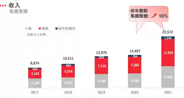 从目前已披露的财报数据来看,李宁在2019、2020、2021的全年营收分别为138.7亿、144.57亿、225.72亿,同比增长分别为32.0%、4.2%、56%,整理来说实现了持续性营收增长。