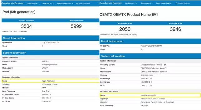 Surface Go 与 iPad 采用了不同的架构和系统,两者并没有太多可以对比的地方。不过在查询了一下 GeekBunch 跑分后,发现有名为 OEMTX EV1 的设备,搭载 Windows 10 Pro 64 位系统和与 Surface Go 相同的英特尔奔腾 4415Y 处理器,其单核和多核跑分成绩分别为 2050 和 3946。而今年三月发布的搭载 A10 Fusion 处理器的 iPad 2018,单核和多核跑分成绩分别为 3504 和 5999。