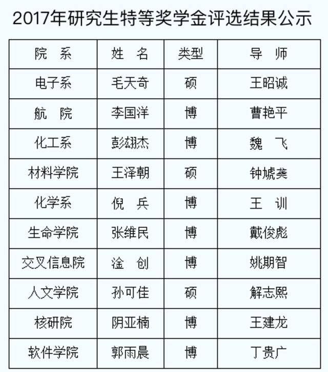 11月22日下午,2017年清华大学研究生特等奖学金评选结果正式公示,来自10个院系的7名博士生与3名硕士生最终获此殊荣。
