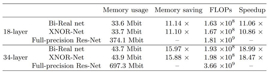 并且 Bi-Real net 比 Xnor net 需要更少的存储空间和计算资源。