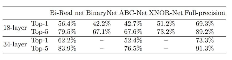从表中的比较可以看到, 本文提出的 Bi-Real net 比 state-of-the-art Xnor Net 精度由显著提升。