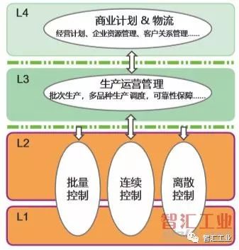 传统的工业企业自动化和信息化参考模型如下图1所示:L1层是设备侧的仪器仪表、阀门、驱动器、电机、智能装备等物理量采集和执行类业务和产品;L2层是一般用于流程行业的分布式控制系统DCS、用于离散行业和公共事业基础设施的可编程逻辑控制器PLC、综合监控系统SCADA、安全系统、电气控制系统等是工业自动化控制类的业务和产品;L3:生产调度执行系统MES、高级排程系统APS、能源管理系统EMS等是生产调度和生产管理类业务和产品;L4:企业资源管理ERP、企业办公OA、客户关系CRM等企业管理类业务和产品。
