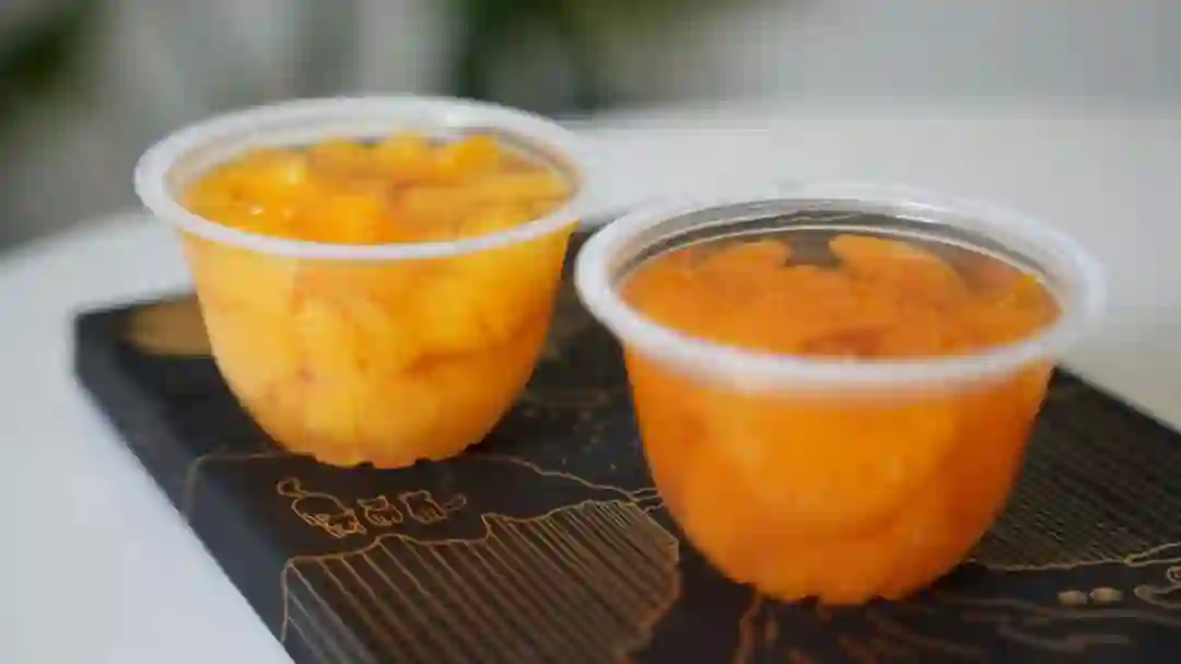 黄桃杯倒是尝起来不甜,特别淡,而且颗粒很小,没有半个半个的真心黄桃罐头果肉大块吃起来爽。