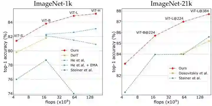 如下图10所示为与 DeiT 训练策略结果的直观对比。使用 ImageNet-21K 预训练,本文的 ViT-L 模型获得了+3.0% 的性能提升。类似地,当在 ImageNet-1K 上从头开始训练时,与之前的最佳方法相比,本文的 ViT-H 的精确度提高了 2.1%,与不使用 EMA 的最佳方法相比,精确度提高了 4.3%。