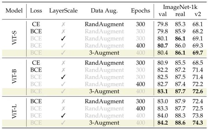 下图2所示为 LayerScale,BCE Loss 等等方法对于精度的影响。