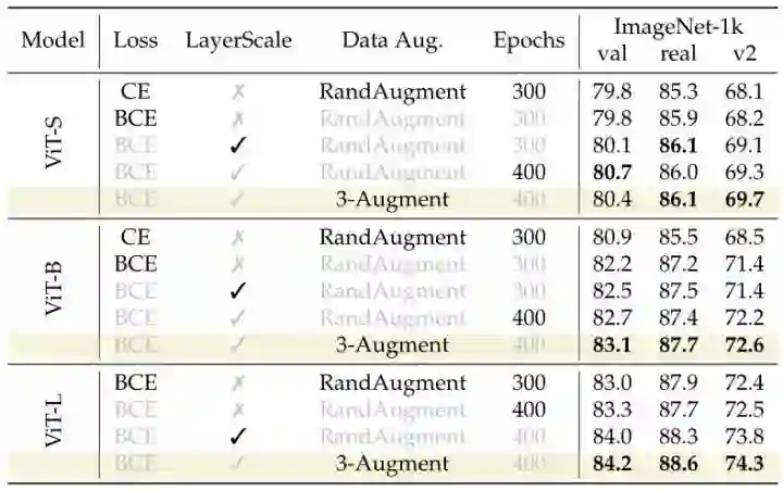 本文重新审视了 ViT 的有监督训练过程,为了把 ViT 的有监督训练做得更好,作者提出了3点方法:使用 Binary Cross Entropy Loss 做训练,同时使用了 ViT 训练过程中的常用策略,比如:Stochastic Depth 和 Layer Scale。一个新的简单的数据增强策略:只包含3个子策略。ImageNet-21k 数据集做预训练时,Simple Random Cropping 的策略比 Random Resize Cropping 的策略更高效。在训练时使用更低的分辨率:减少了训练-测试的差异,对于 224×224 的目标分辨率,以 126×126 (81个 tokens ) 的分辨率预训练的 ViT-H 在 ImageNet-1k 上比以 224×224 (256 个 tokens) 的分辨率预训练时实现了更好的性能,且对于预训练的要求也较低,因为 token 数量减少了 70%。本文希望这一更强的基线训练策略能够帮助社区在基础视觉架构的设计方面作出更多贡献。
