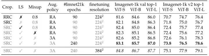 在 ImageNet-21K (比 ImageNet-1K 大10倍) 的情况下,过拟合的风险较小,RRC 提供的正则化和多样性就显得不太重要了。在这种情况下,SRC 减少了训练和测试之间尺寸的差距,同时使得裁剪后的图像与真值标签更加匹配,因为 RRC 在很多情况下得到的裁减之后的图片的 GT 对象甚至不包含在裁剪的图片中了。SRC 相对而言则更不可能发生这种情况,因为它覆盖了更大部分的图像像素。如下图6所示为 ImageNet-21K 上不同策略的消融实验,可以看到 SRC 相比 RRC 显著提升了性能。