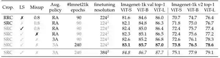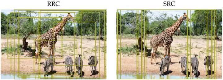 如上图5所示为 RRC 和 SRC 方法的采集恩结果,RRC 可以提供更多的尺寸。相比之下,SRC 覆盖了整个图像的大部分,并保持了宽高比,但提供的多样性较少。因此,在 ImageNet-1K 上训练时,使用常用的 RRC 性能会更好。