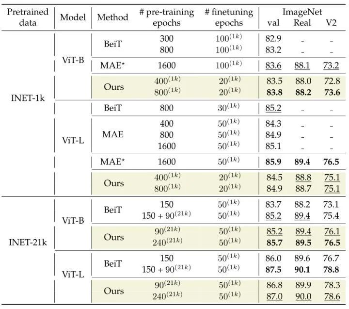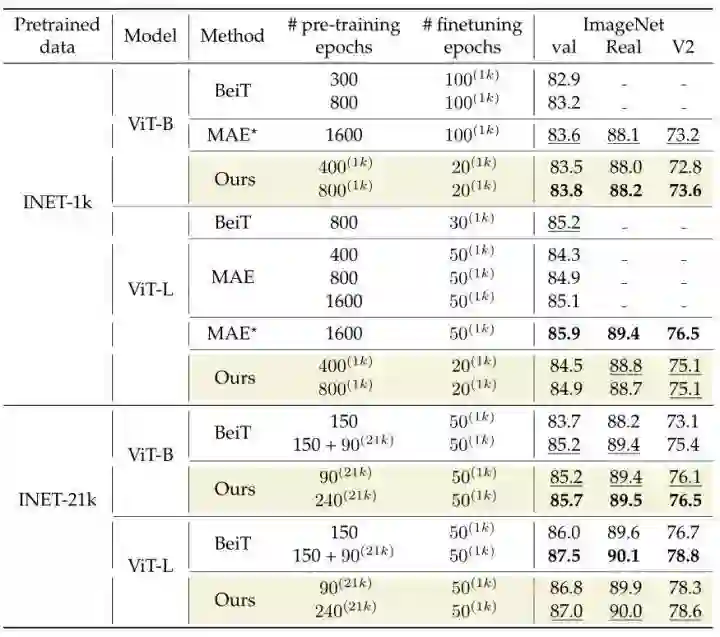 如下图13所示为用本文的训练方法训练的 ViT 模型和用不同的 BerT-like 方法训练的 ViT 的性能对比。本文的训练策略依然能够在相当的 Epoch 的情况下实现超过 BEiT,MAE 等经典方法的性能。